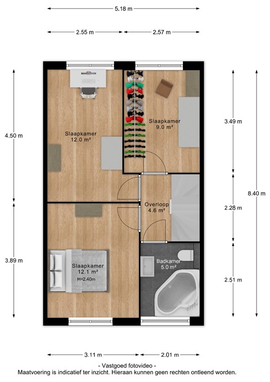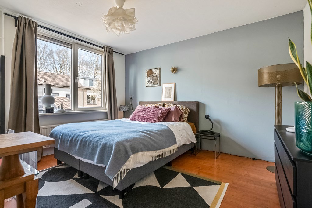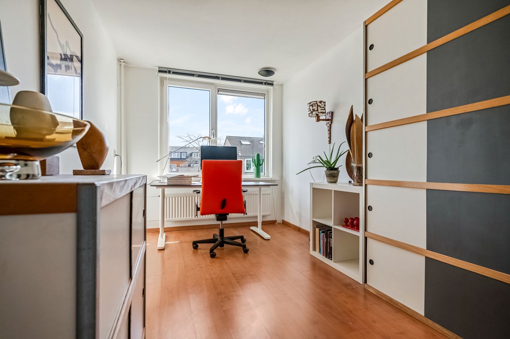 Op de eerste verdieping bevinden zich drie ruime, volwaardige slaapkamers en de badkamer. De eerste en tweede slaapkamer zijn beide circa 12 m² groot en bieden volop ruimte voor een groot tweepersoonsbed en een kledingkast. De derde kamer (circa 9 m²) is momenteel ingericht als kledingkamer, maar is ook uitstekend geschikt als volwaardige slaapkamer, werk- of hobbyruimte. De badkamer is uitgevoerd met een ligbad met douche, wastafel en een tweede toilet.