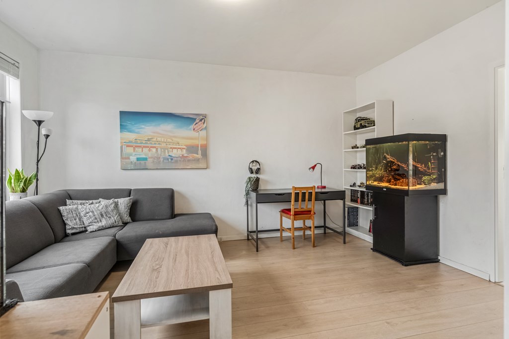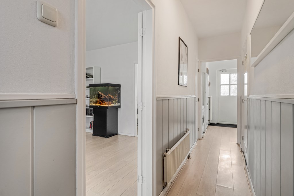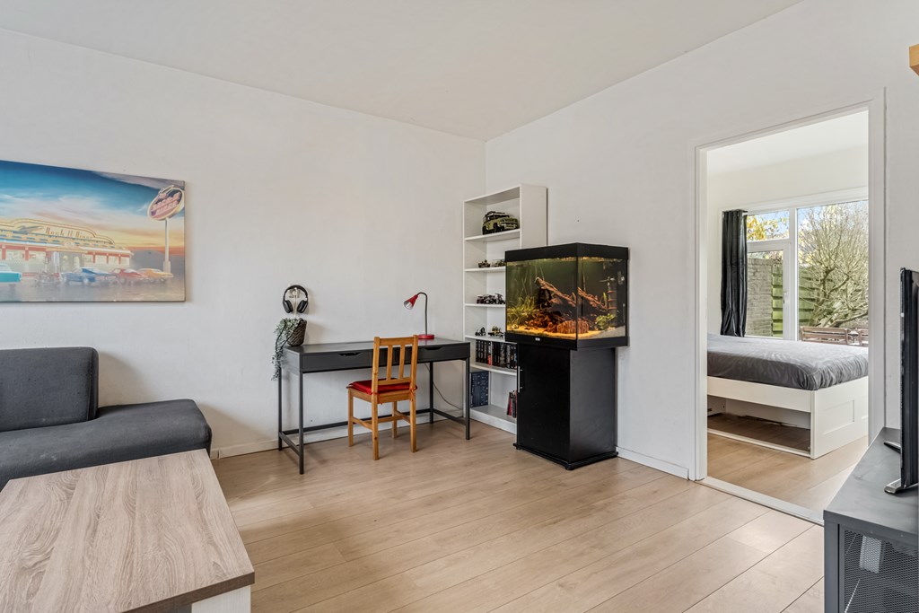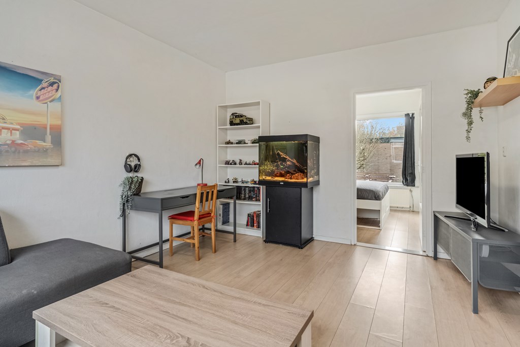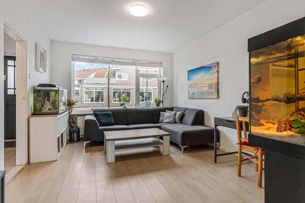 De woning wordt betreden via een verzorgde hal, welke in verbinding staat met de woonkamer, badkamer en keuken. De woonkamer ligt aan de voorzijde van de woning en valt direct op door de brede raampartij. Hierdoor komt er enorm veel daglicht binnen, waardoor de ruimte licht en uitnodigend aanvoelt. De woonkamer is een heerlijke leefruimte waar je je meteen thuis voelt. De indeling is praktisch: er is voldoende plek voor een grote zithoek en een eettafel.