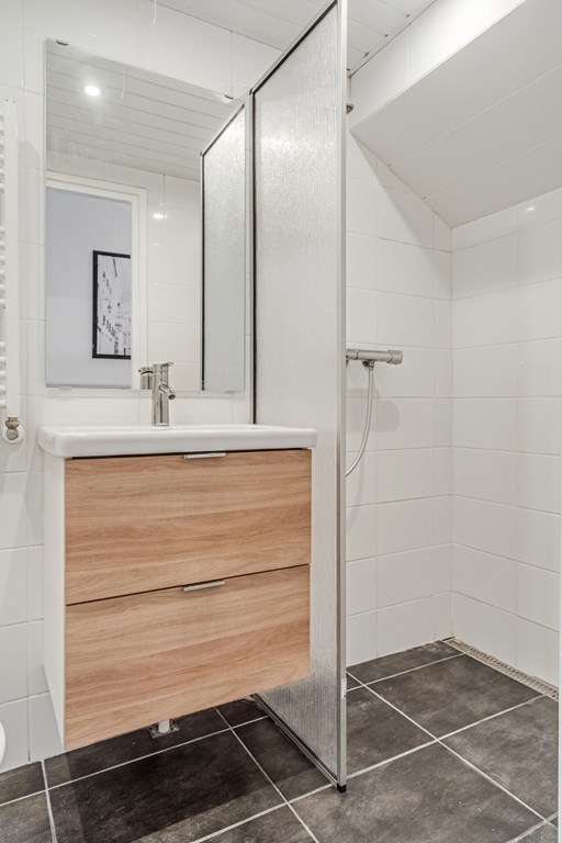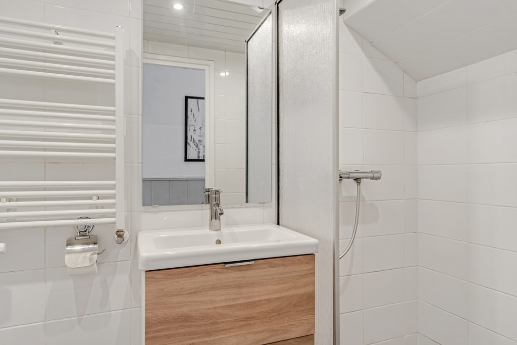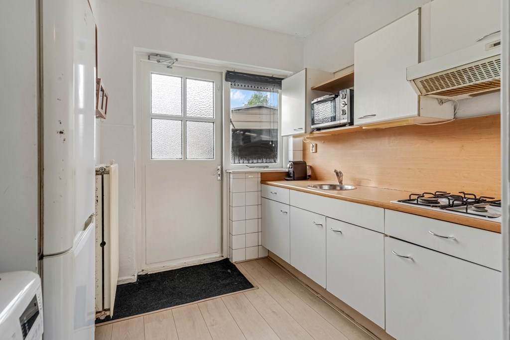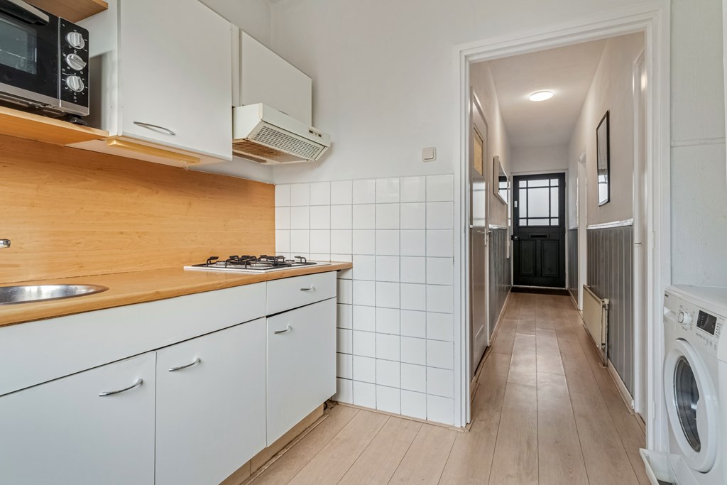 De badkamer is modern en neutraal afgewerkt en beschikt over een inloopdouche, een recent geplaatst wastafelmeubel en toilet. De separate keuken is eenvoudig uitgevoerd, maar netjes onderhouden. Een ideale plek om op termijn jouw droomkeuken te realiseren.